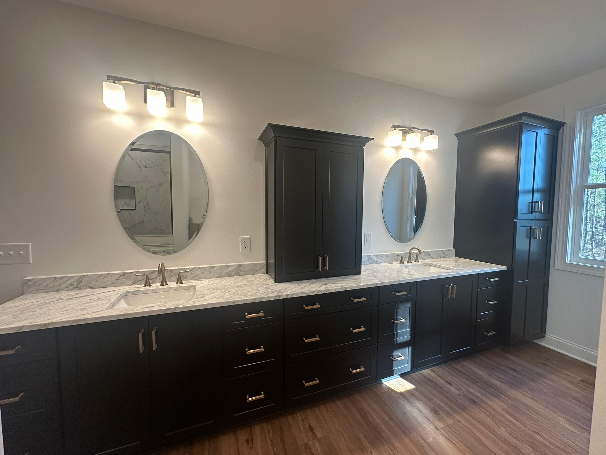 The primary suite offers a private retreat with a spa-inspired bathroom featuring a double vanity, stone countertops, modern fixtures, and a tiled walk-in shower with frameless glass. Additional bathrooms throughout the home maintain the same level of craftsmanship and cohesive design.