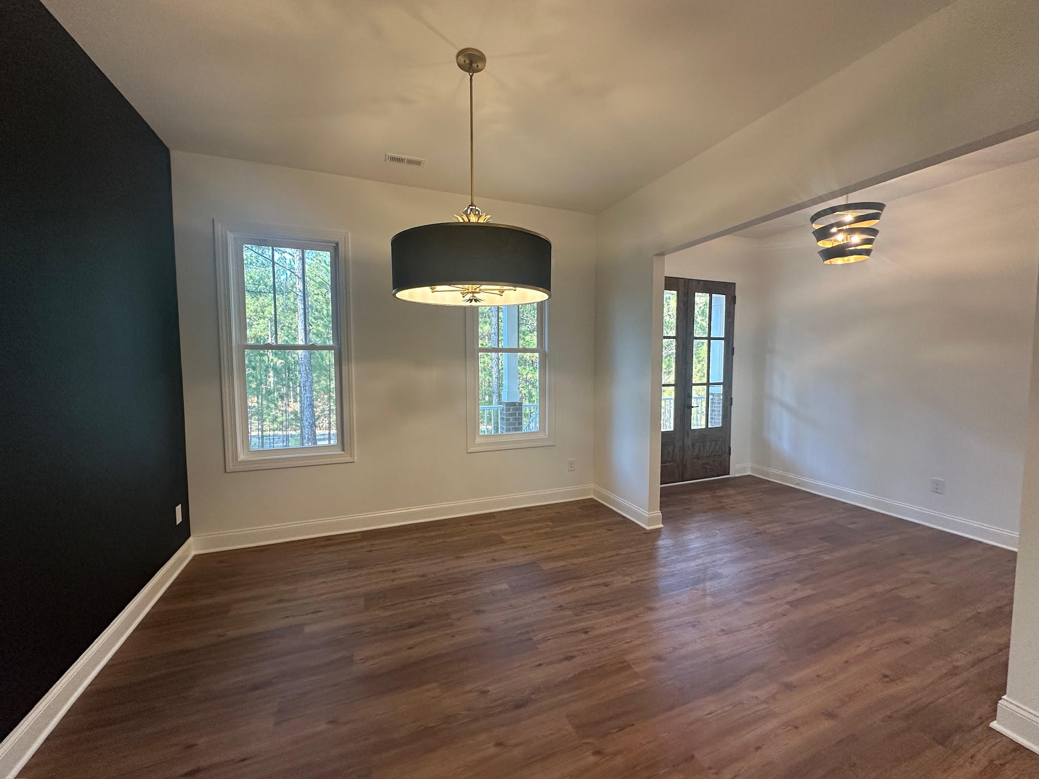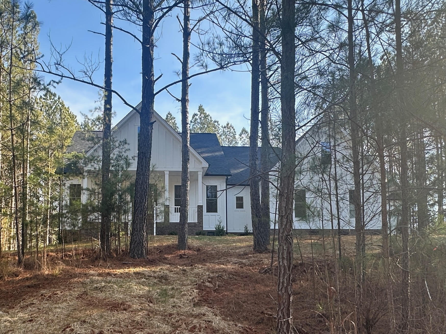 This custom-built home is a refined take on modern farmhouse design, thoughtfully crafted by Smart Construction to balance timeless character with contemporary comfort. Set on a private, wooded lot, the exterior features crisp white board-and-batten siding, brick foundation detailing, and a welcoming covered front porch that creates classic curb appeal with a clean, modern edge.