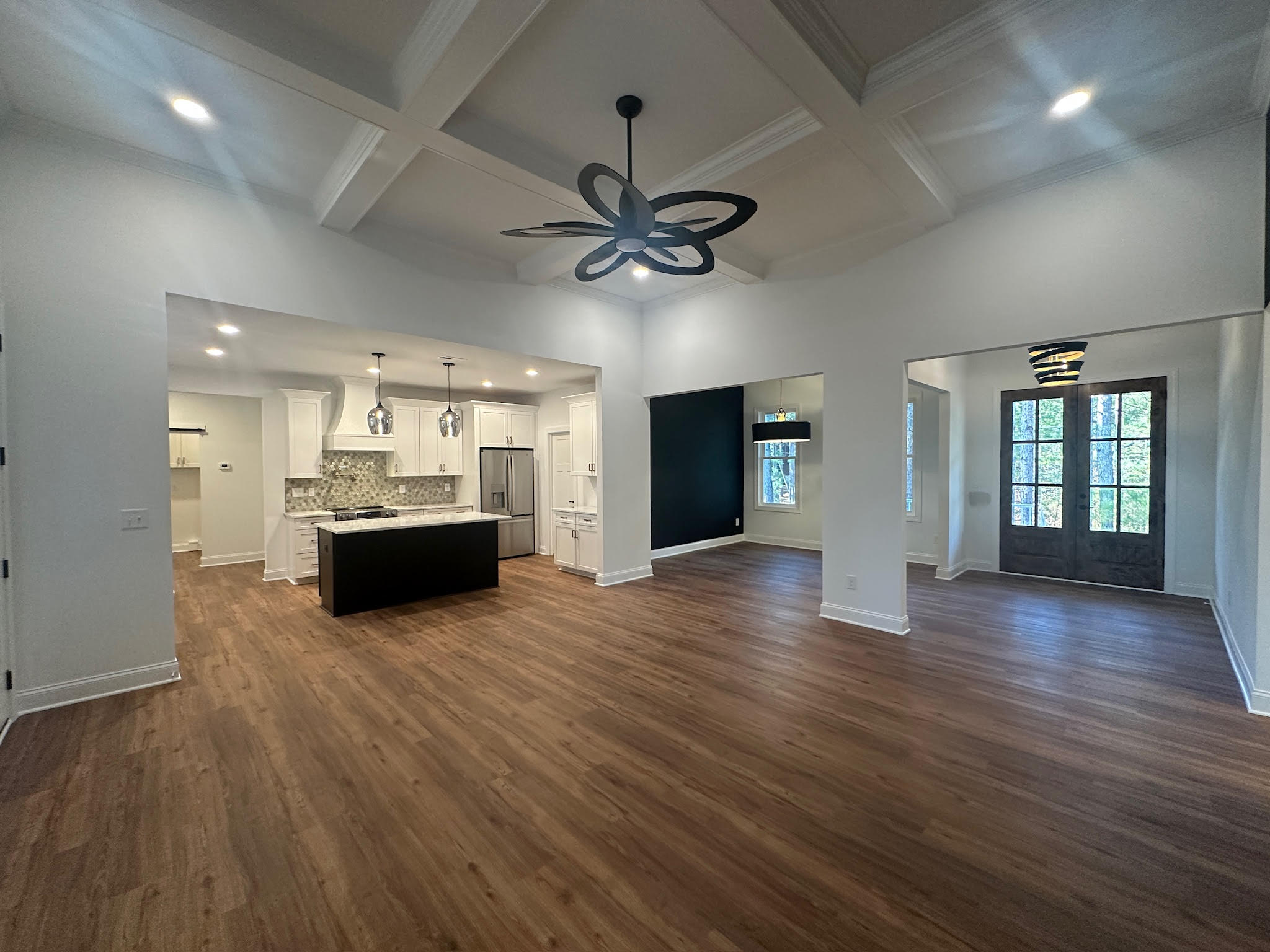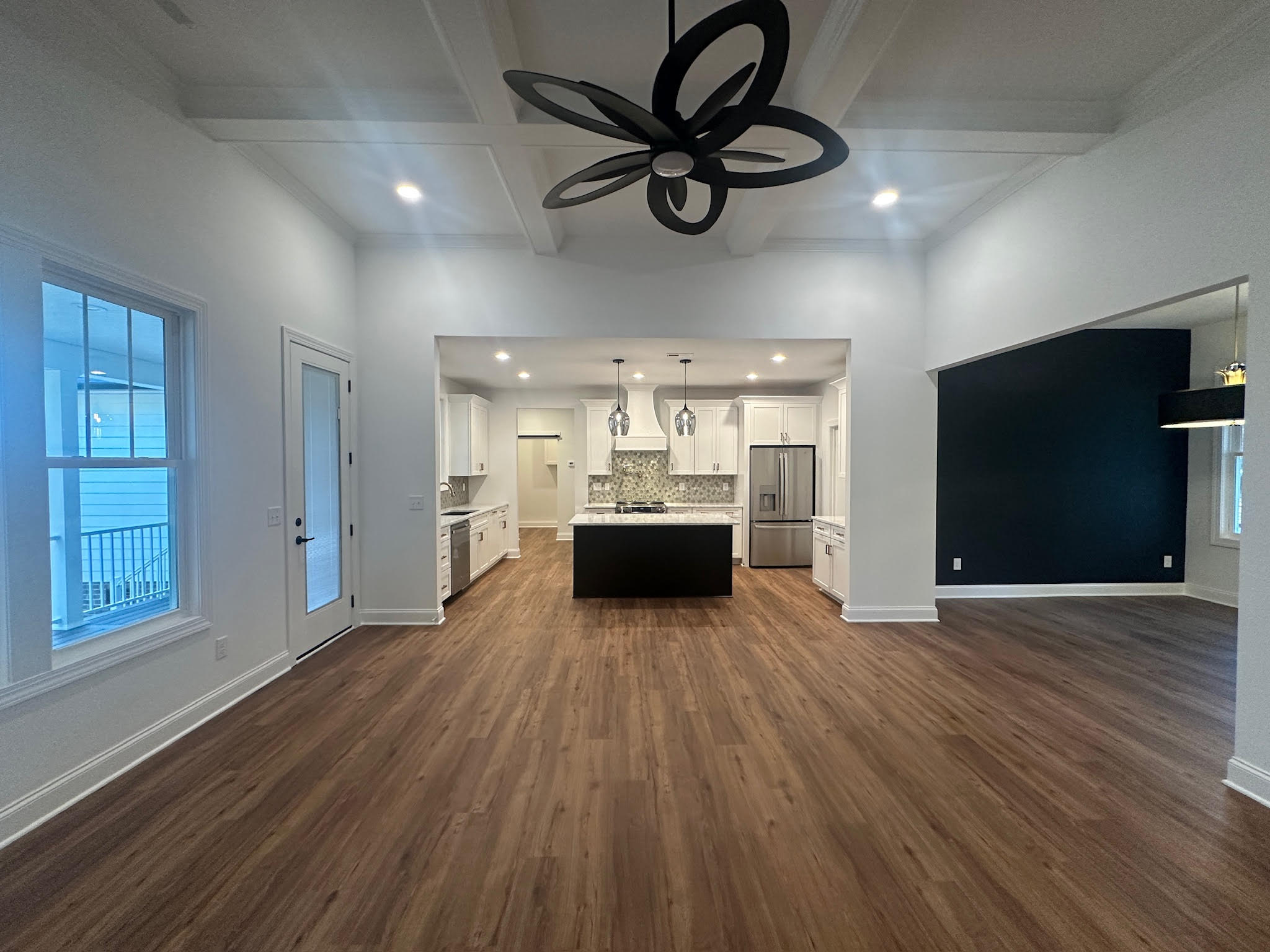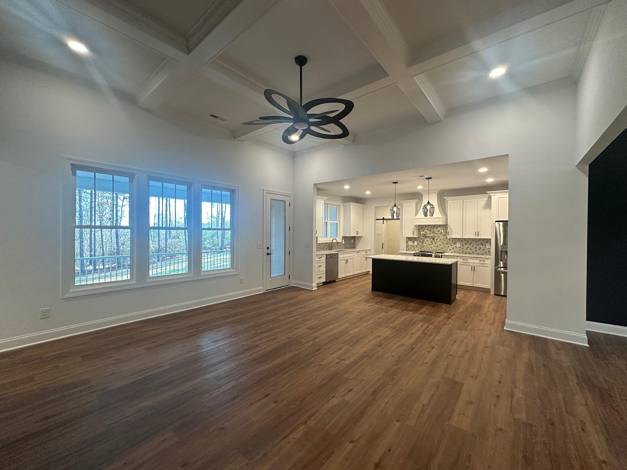 Inside, the home opens to a spacious open-concept layout anchored by warm wood flooring and abundant natural light. The living area features a dramatic coffered ceiling and statement lighting, creating an inviting space that flows seamlessly into the kitchen and dining areas—ideal for both everyday living and entertaining.