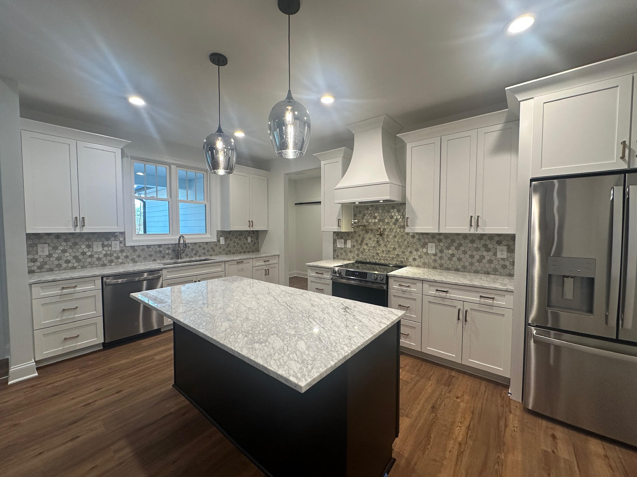 The kitchen is designed to be both functional and striking, showcasing white custom cabinetry, a bold contrasting island, quartz countertops, stainless steel appliances, and decorative tile backsplash. Thoughtful details such as pendant lighting and ample workspace elevate the kitchen into a true centerpiece of the home. A generous walk-in pantry with custom shelving provides both organization and convenience.
