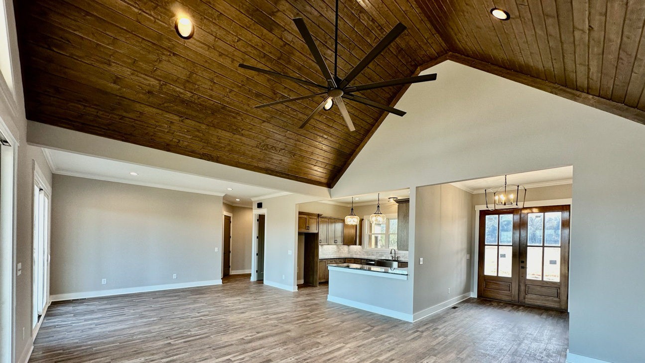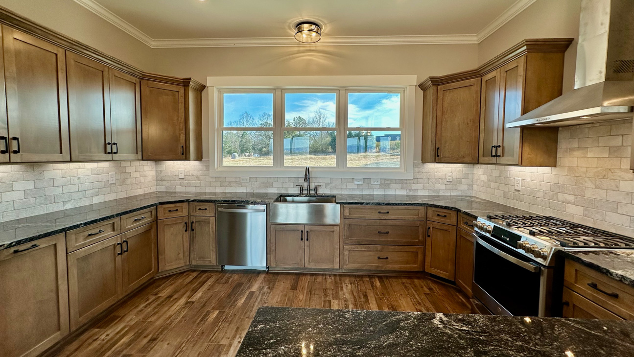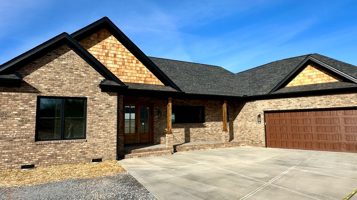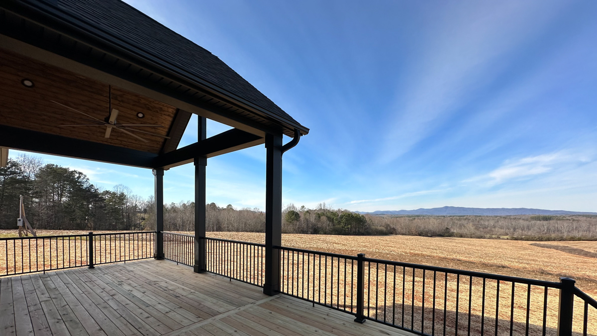 This classic ranch is located in Lawndale, NC. Amenities include cathedral tongue and groove wood ceilings in the great room and on the back deck, custom stained maple cabinets, quartz countertops, a travertine backsplash in the kitchen and a large ceramic tile shower with a pebble floor and frameless glass panels in the primary bath. Gray doors, charcoal grout, black brick mortar and black gutters and exterior trim provide a contrast that adds a modern flare. The two sets of sliding doors in the great room open to a large deck for a marvelous view of the sunset over the NC mountains.