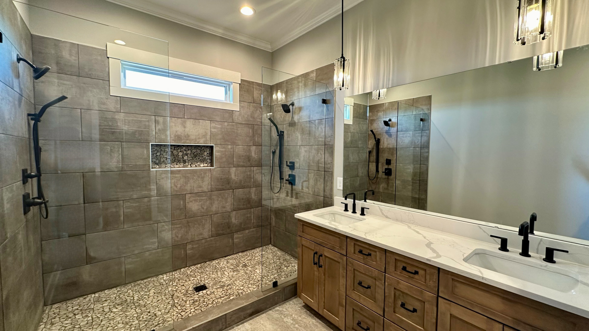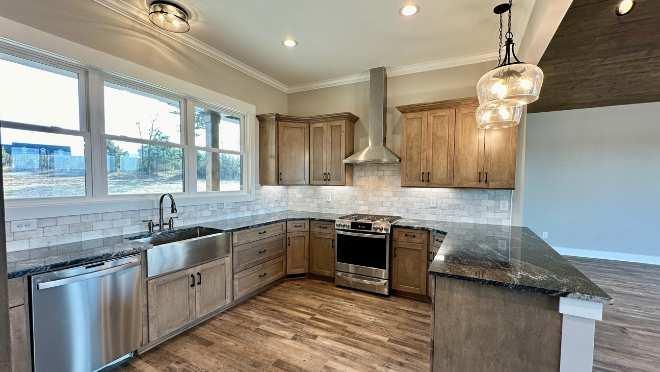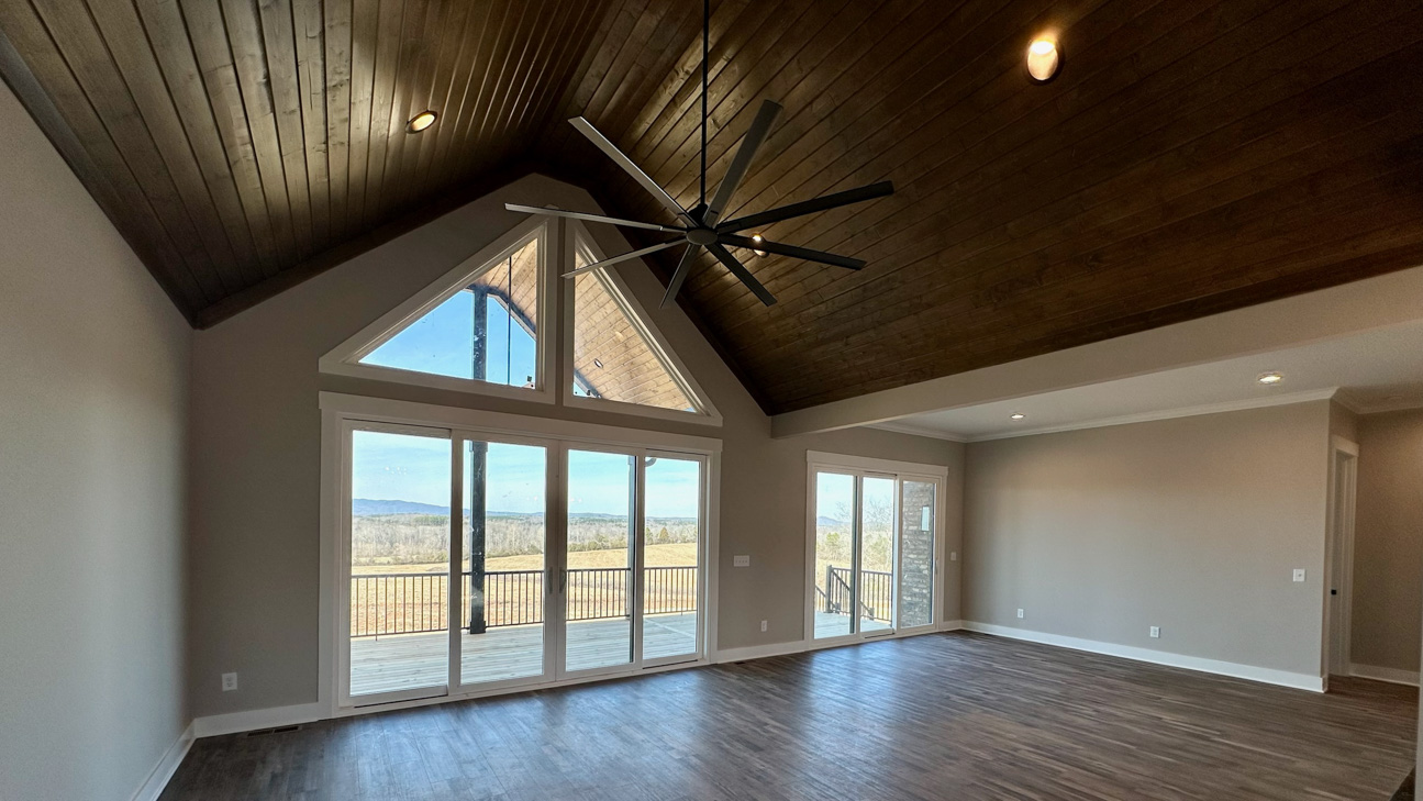 This classic ranch is located in Lawndale, NC. Amenities include cathedral tongue and groove wood ceilings in the great room and on the back deck, custom stained maple cabinets, quartz countertops, a travertine backsplash in the kitchen and a large ceramic tile shower with a pebble floor and frameless glass panels in the primary bath. Gray doors, charcoal grout, black brick mortar and black gutters and exterior trim provide a contrast that adds a modern flare. The two sets of sliding doors in the great room open to a large deck for a marvelous view of the sunset over the NC mountains.