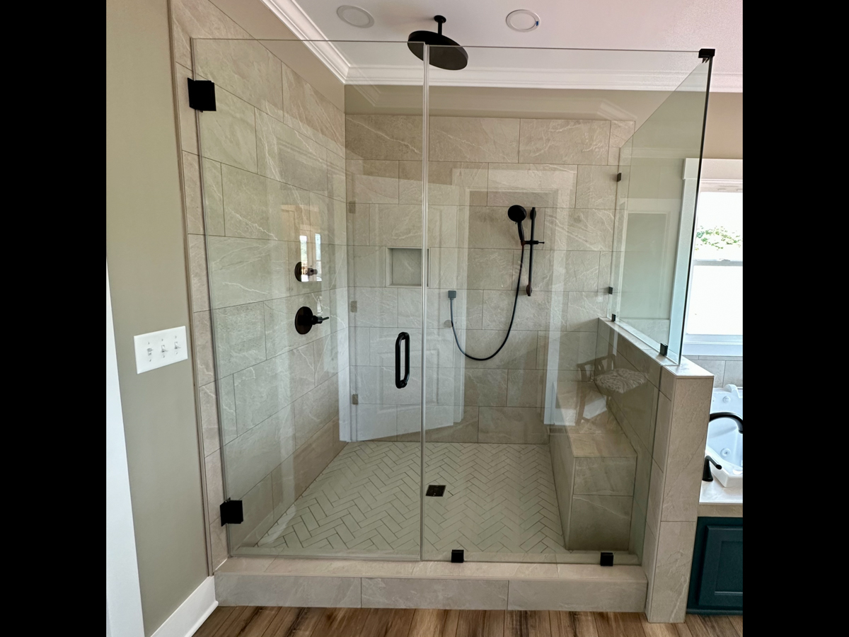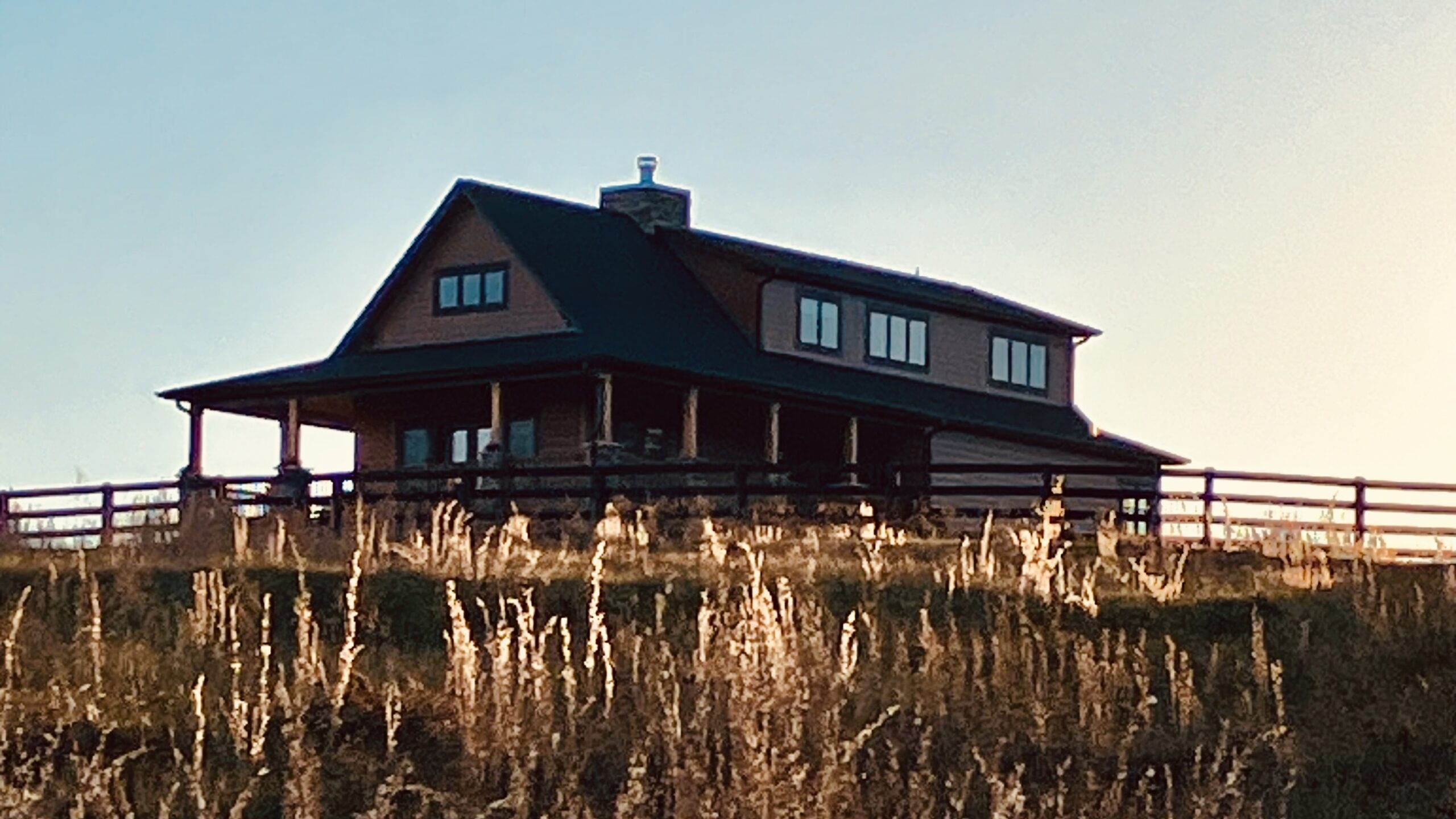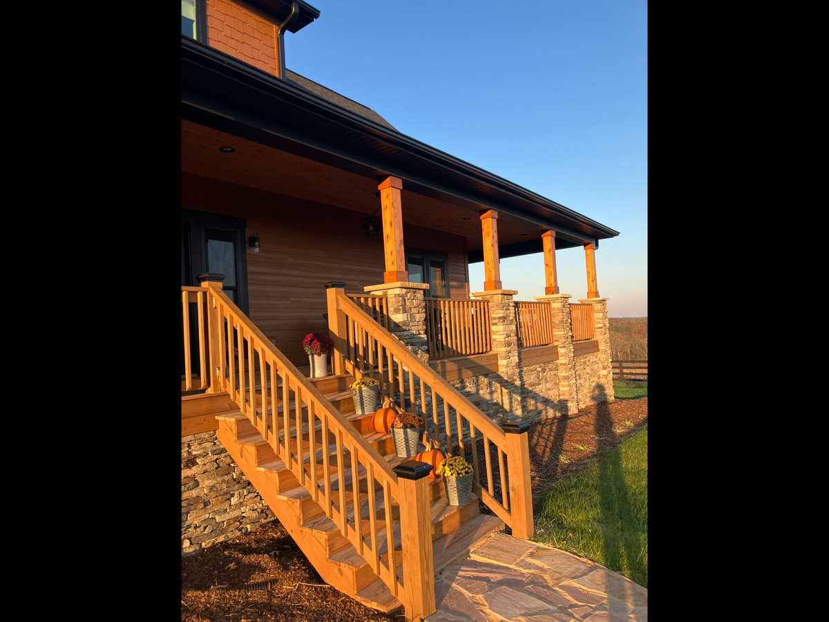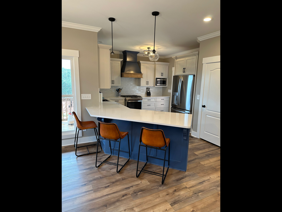 Magnificent views of the NC mountains frame the setting for this custom cabin with modern touches. The two-sided stone fireplace divides the dining and living spaces.The wooden ceiling beams add a rustic touch. Blue and white custom cabinets with neutral tile selections are perfect for the kitchen and bath. And the wrap around porch provides a relaxing spot to enjoy the beautiful views.