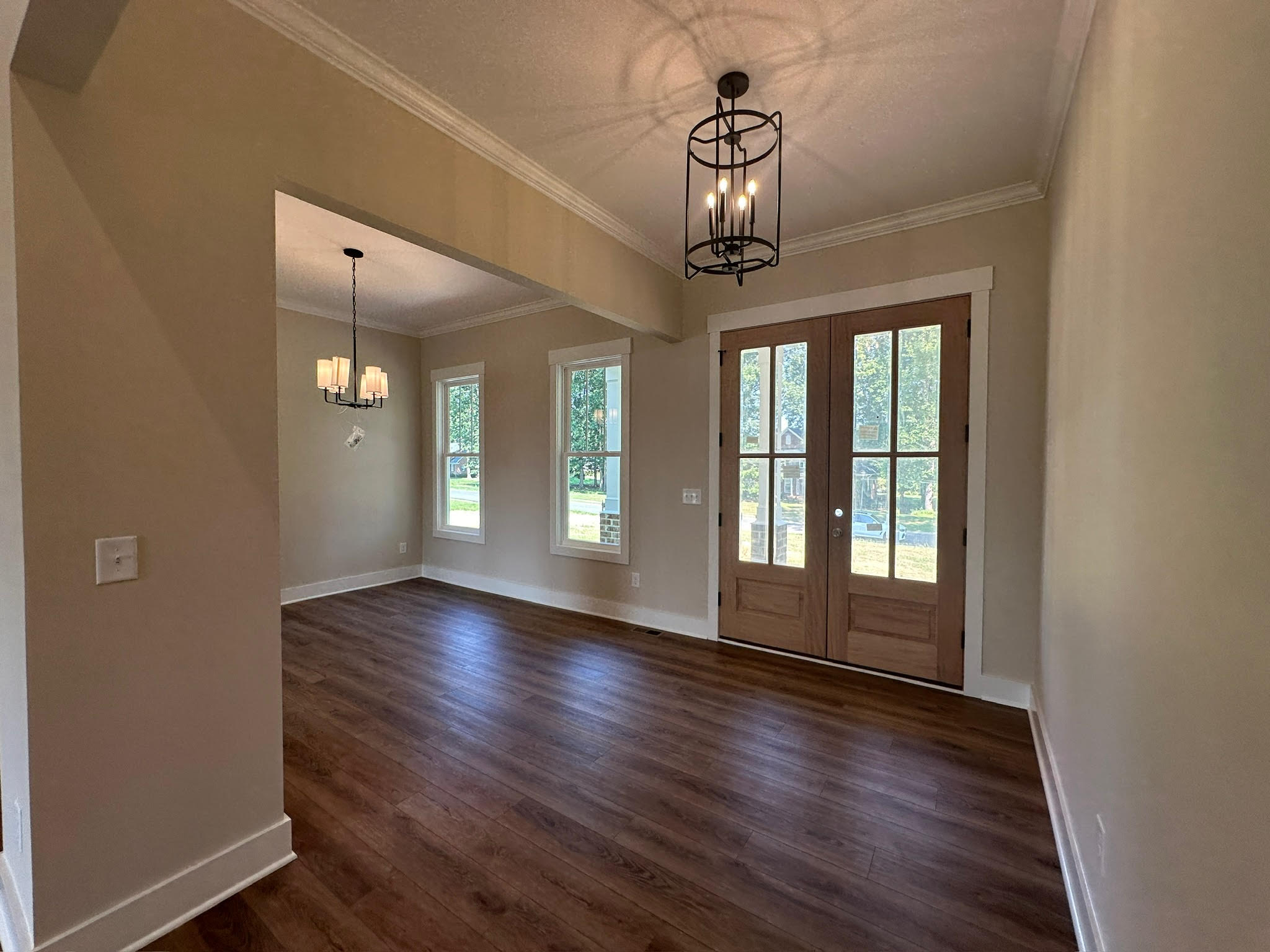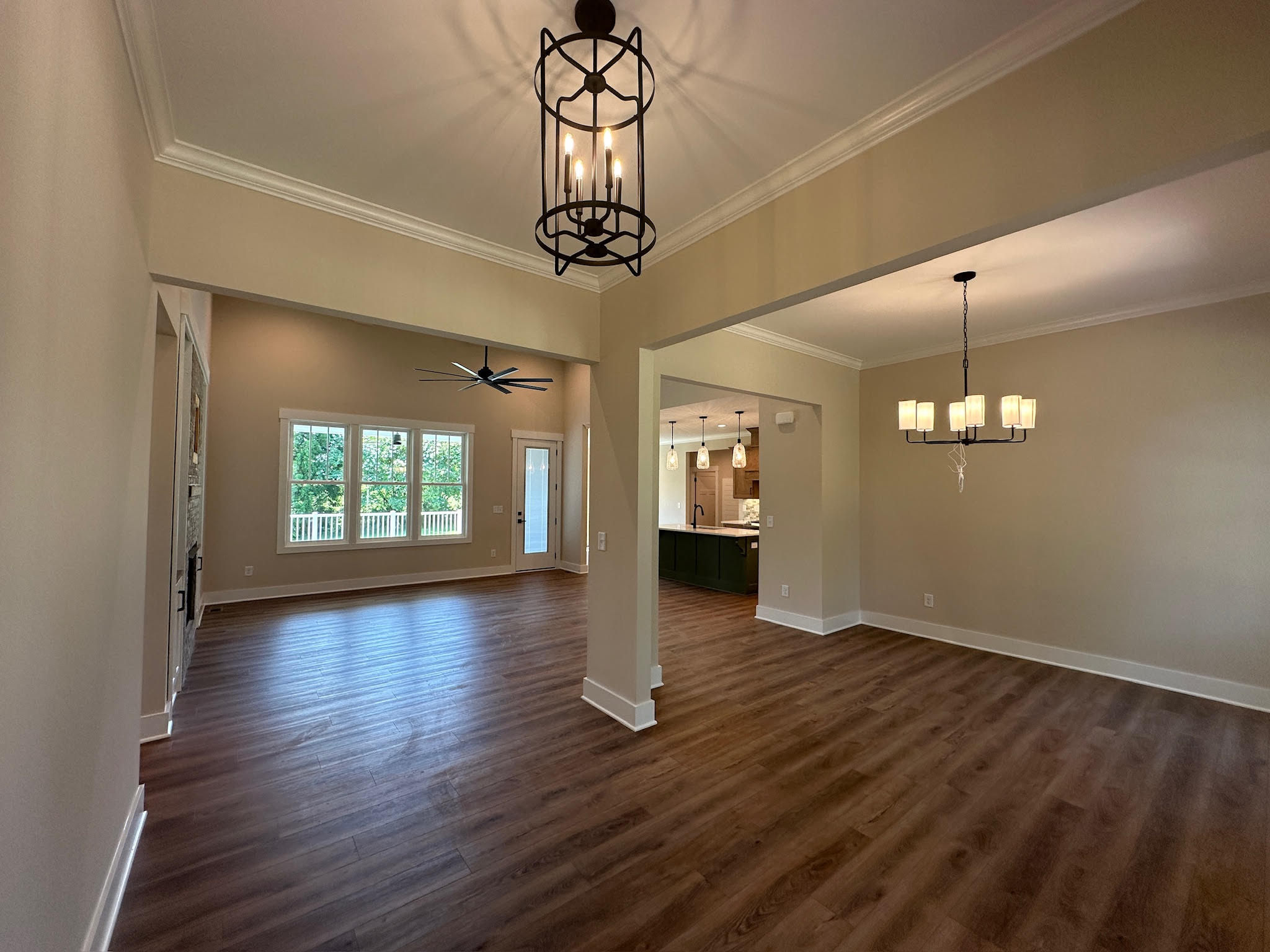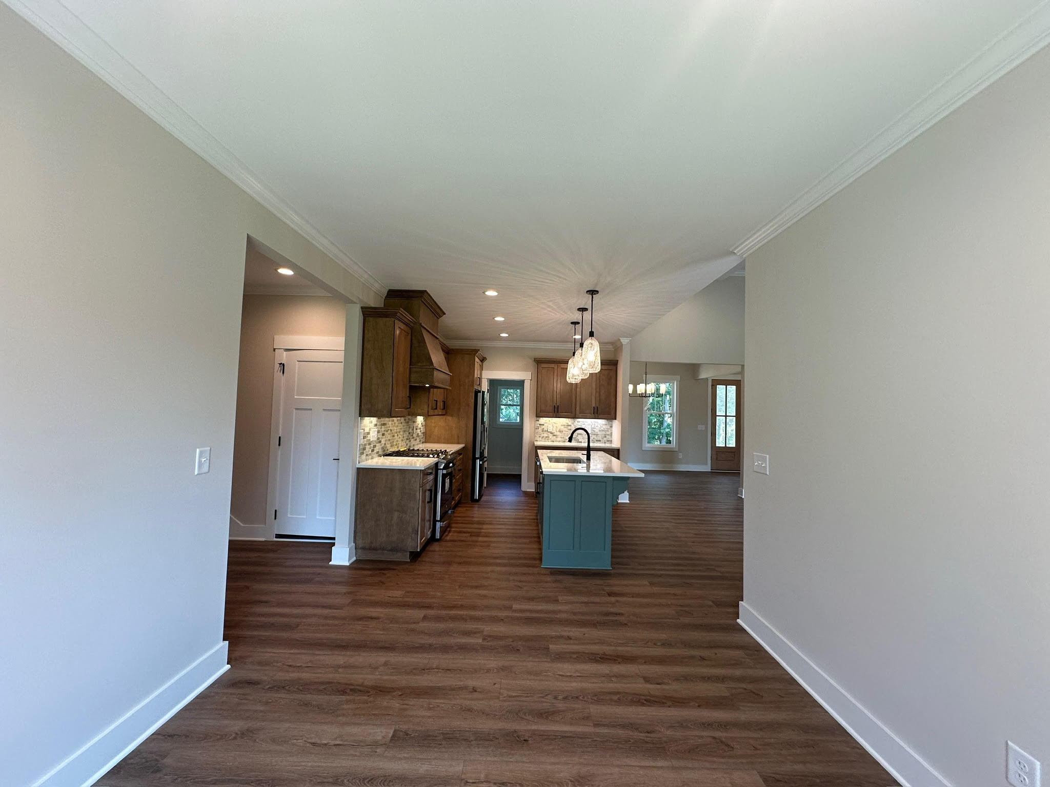The open-concept main living area features wide-plank flooring, abundant natural light, and a seamless flow between the kitchen, dining, and living spaces—ideal for both everyday living and entertaining. The kitchen serves as a true centerpiece, offering custom cabinetry, a statement island with contrasting finish, quartz countertops, premium appliances, and designer lighting that adds warmth and character.