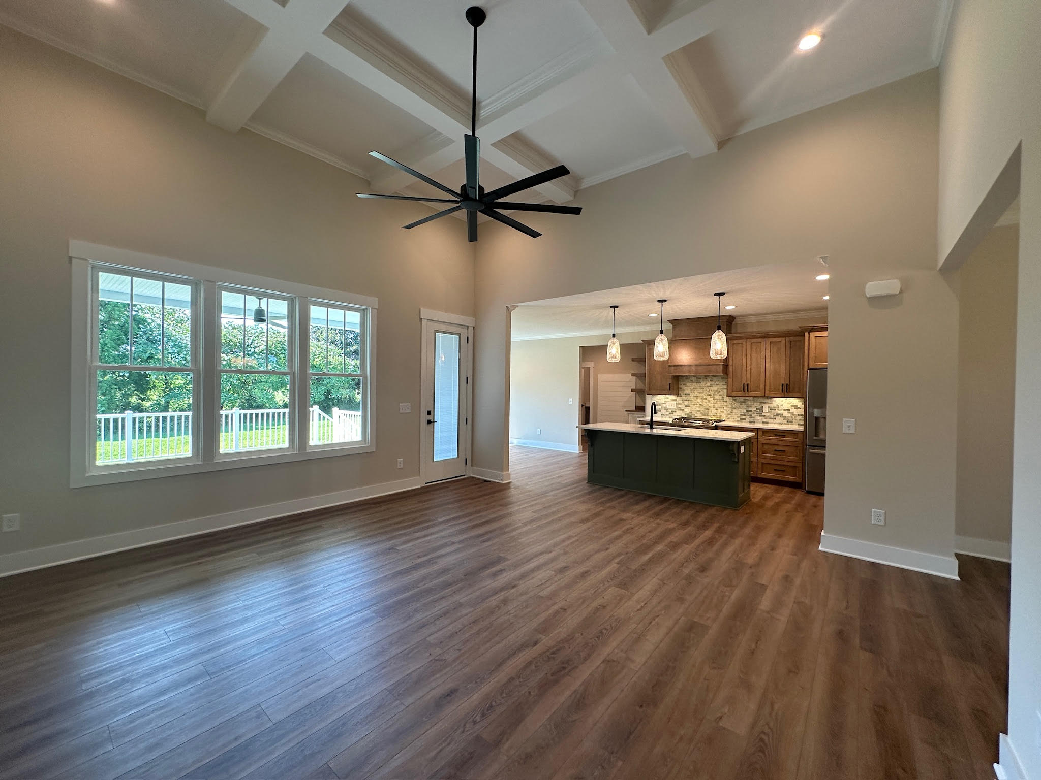 The living room is anchored by a brick fireplace with built-in cabinetry, creating a cozy yet elevated focal point. Thoughtful architectural elements such as coffered ceilings, custom trim work, and built-in shelving add depth and distinction throughout the home.