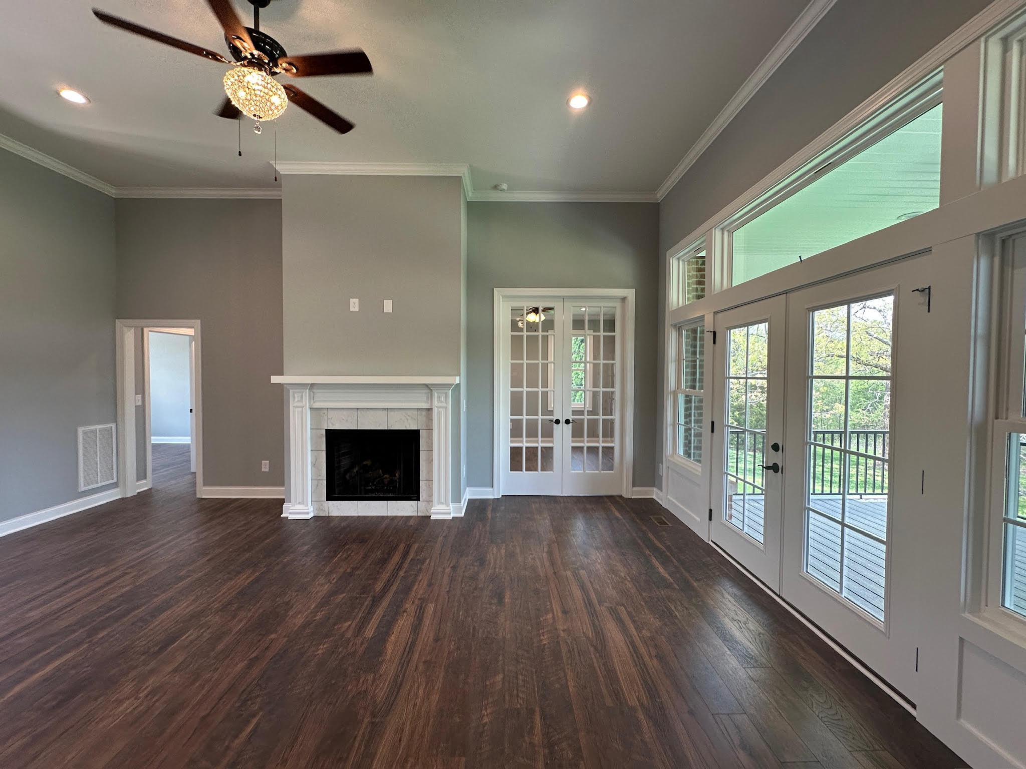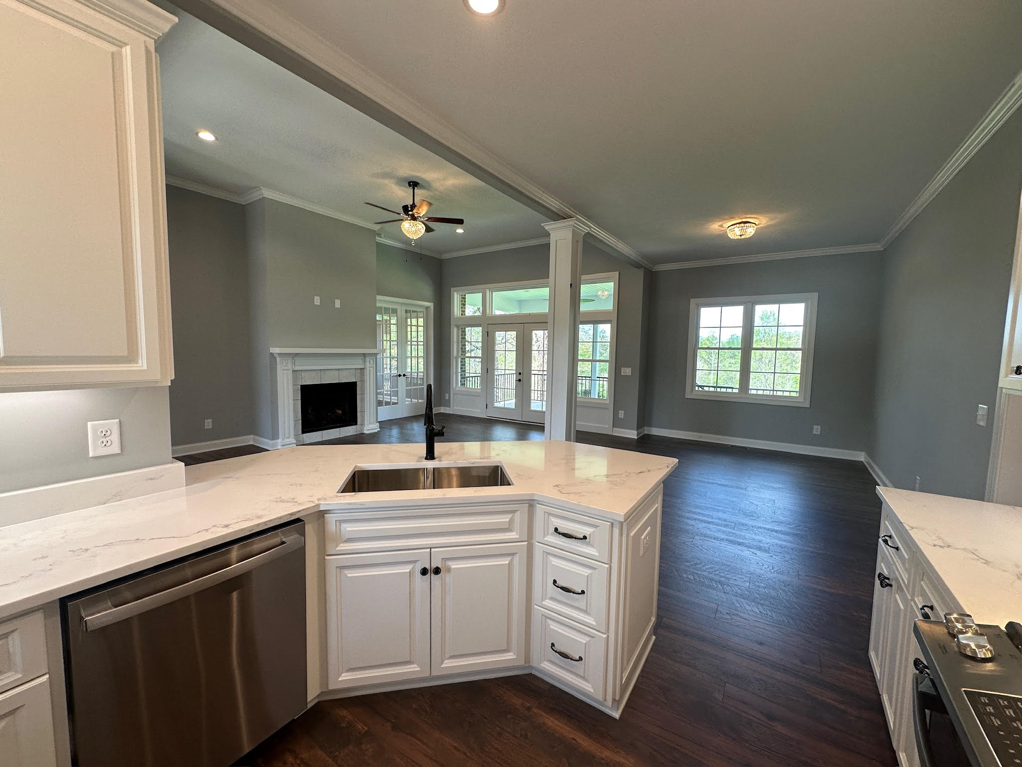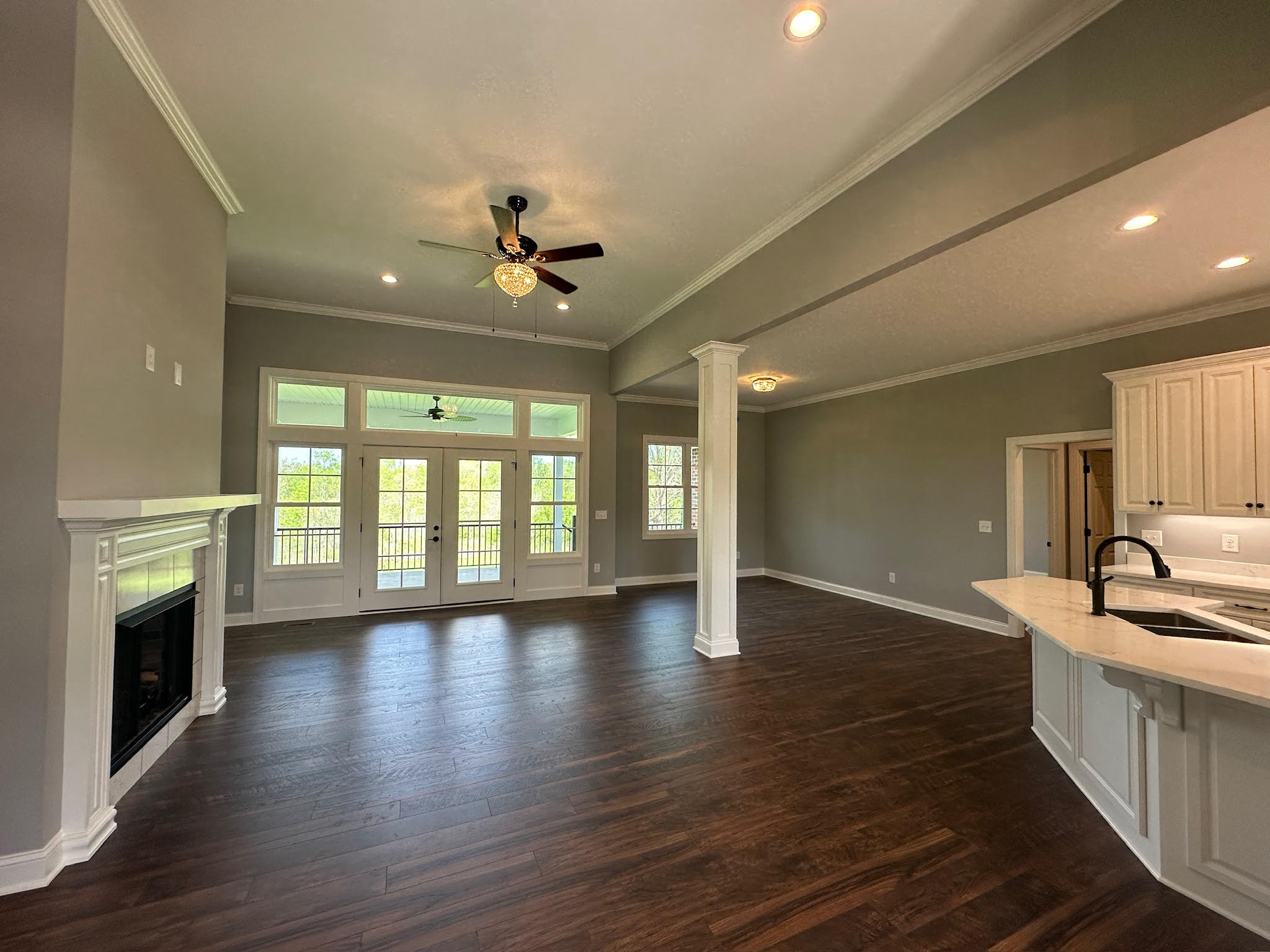 Inside, the home opens to bright, airy living spaces with an open-concept layout that maximizes both flow and function. Wide plank flooring, refined trim work, and soft neutral tones create a cohesive and elegant backdrop throughout. The main living area is anchored by a fireplace and expansive windows that flood the space with natural light, seamlessly connecting to the covered rear porch for effortless indoor-outdoor living.