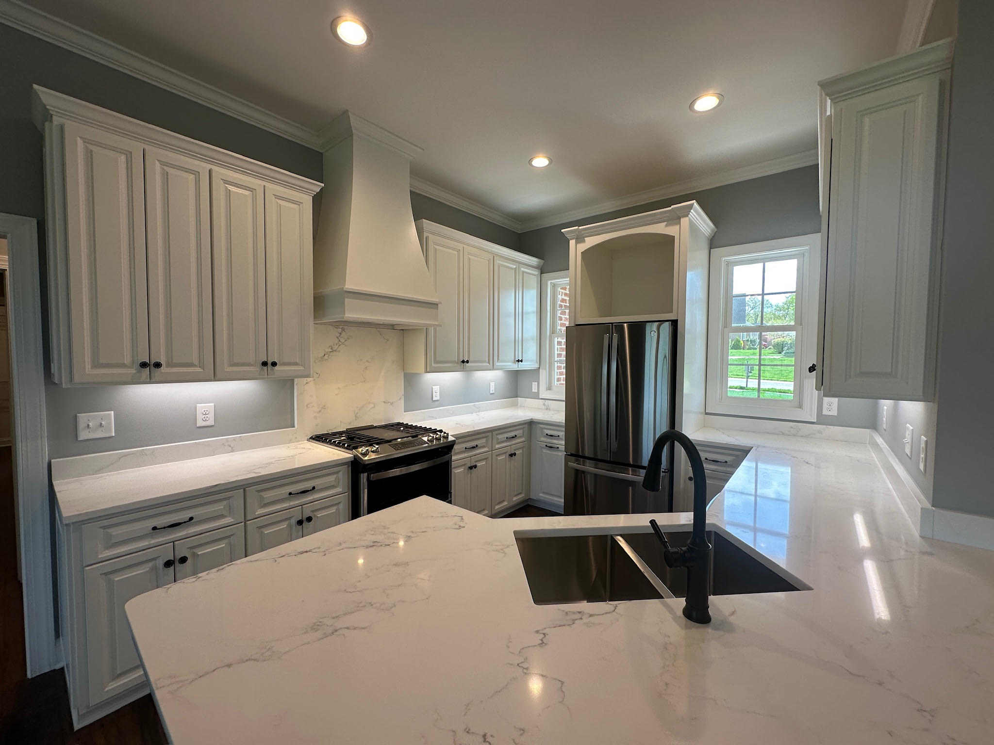 The kitchen is both beautiful and functional, featuring custom cabinetry, quartz countertops, stainless steel appliances, and a large island designed for gathering and entertaining. Thoughtful sightlines keep the kitchen connected to the living and dining areas, making it ideal for everyday living and hosting alike.