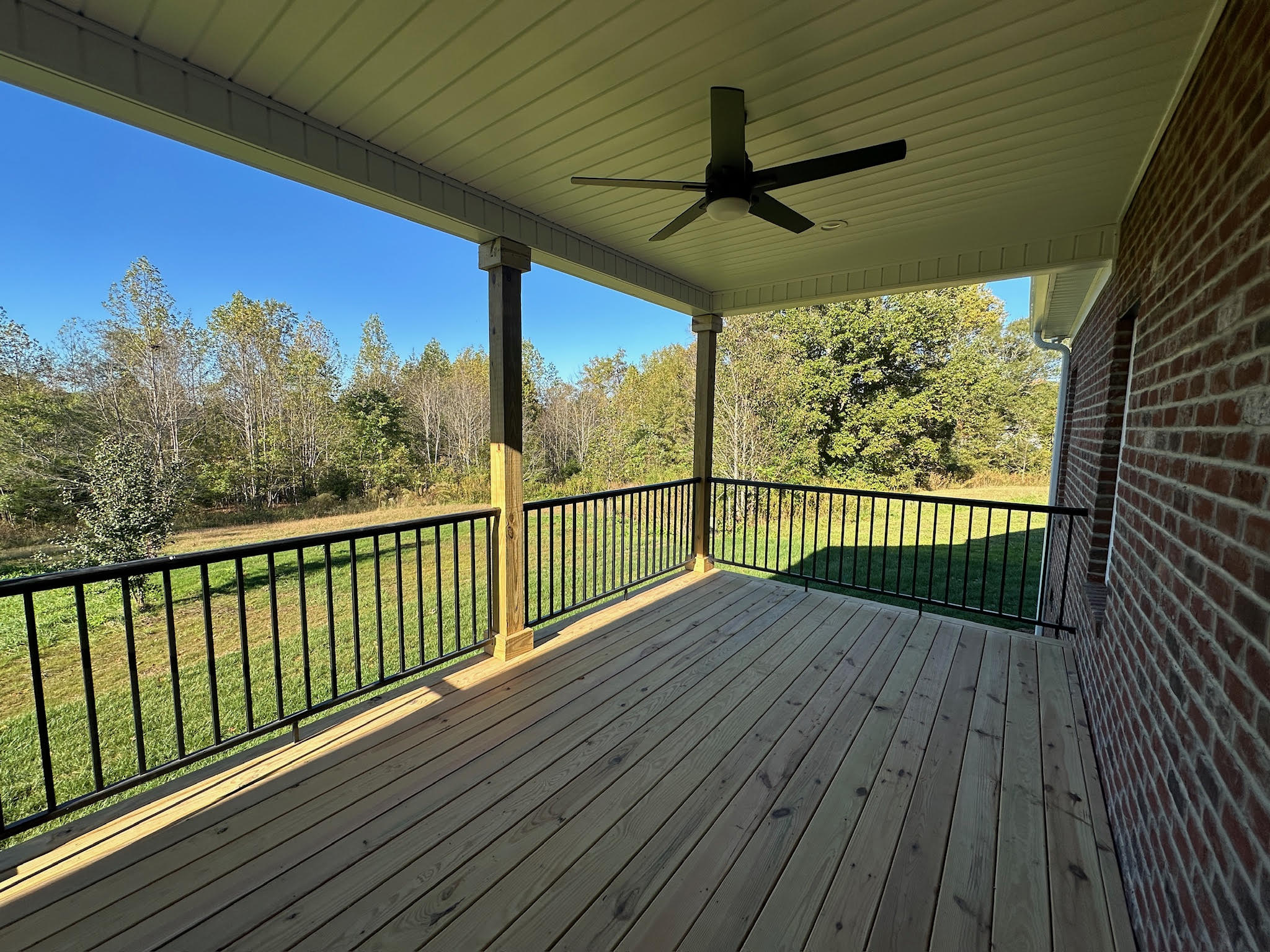 Outdoor living is extended with a covered rear porch and deck, complete with a ceiling fan and railing—perfect for relaxing, entertaining, or enjoying the surrounding views. A spacious garage, smart storage solutions, and a well-planned layout complete the home.