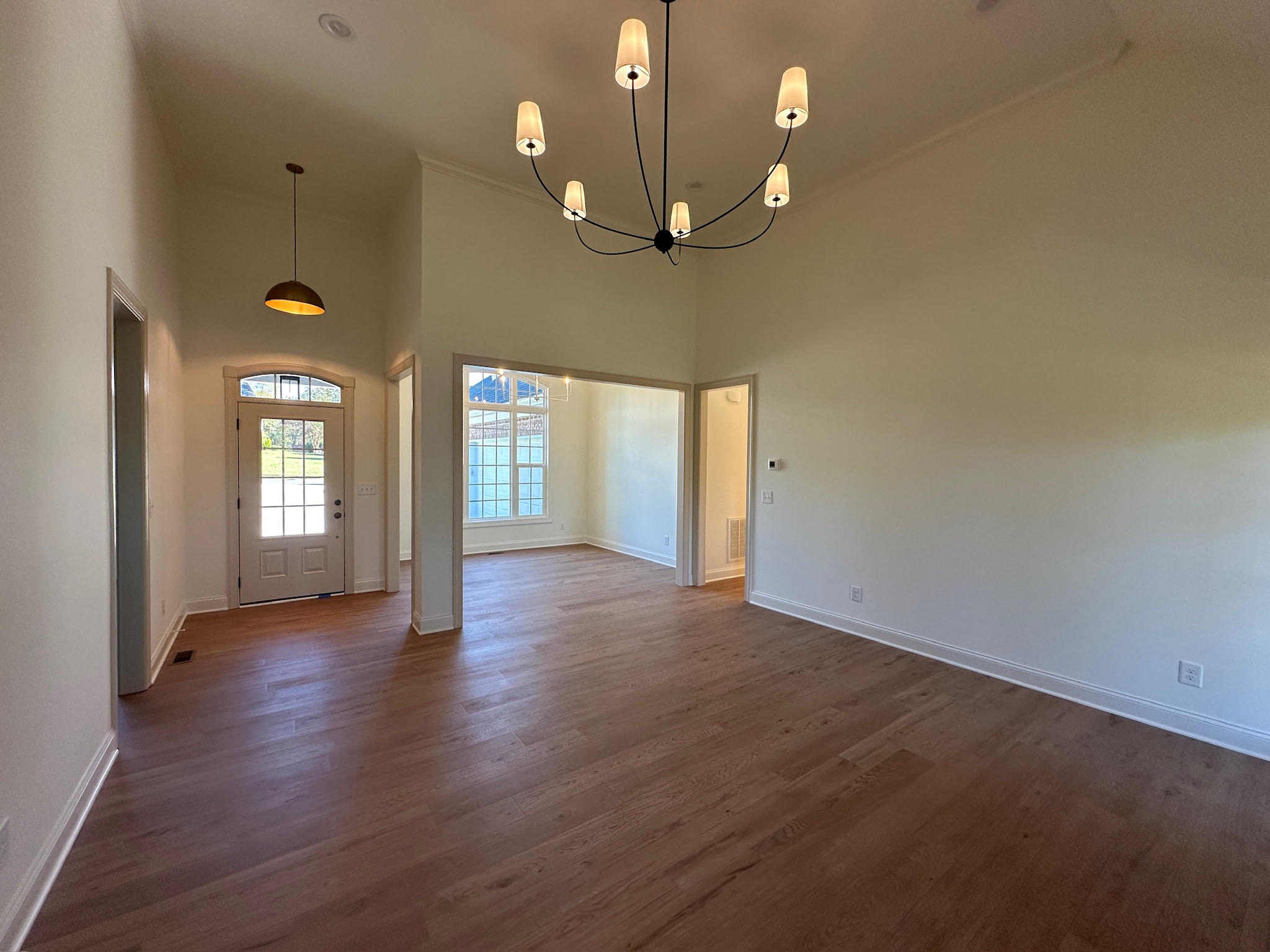 Inside, the home opens to a bright, open-concept living space with vaulted ceilings and wide-plank hardwood flooring that flows throughout the main areas. The living room is anchored by a custom fireplace and filled with natural light, offering a warm and inviting space for everyday living and entertaining.