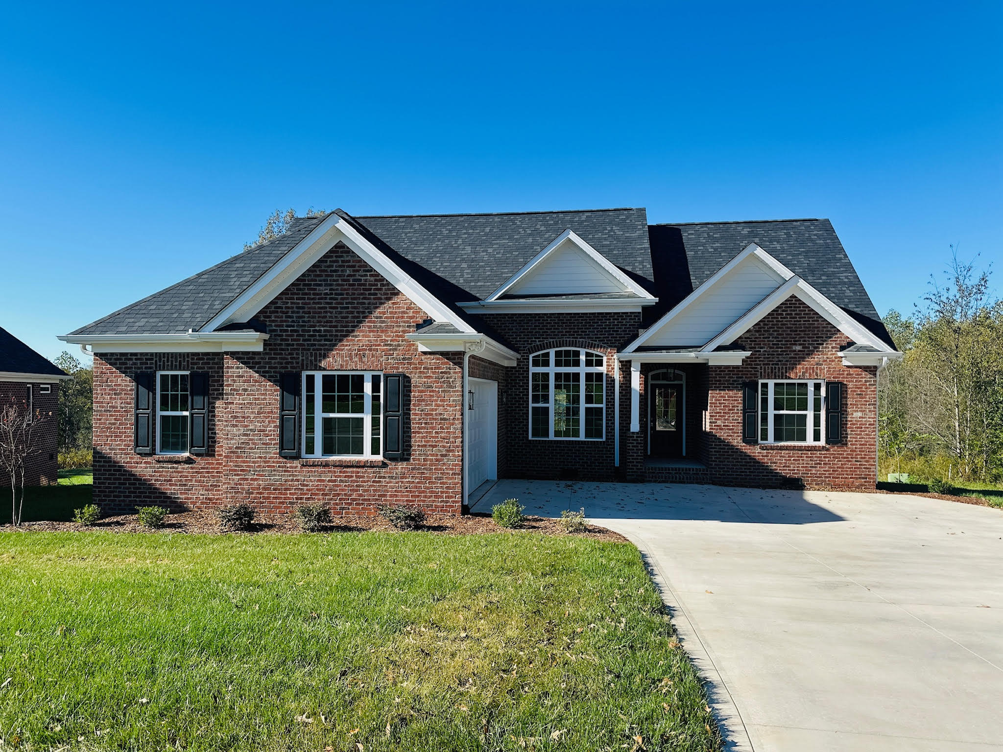 This classic brick custom home blends timeless architecture with modern interior design, thoughtfully crafted by Smart Construction. The welcoming front elevation features layered gables, crisp white trim, and traditional shutters—creating refined curb appeal that feels both elegant and approachable.