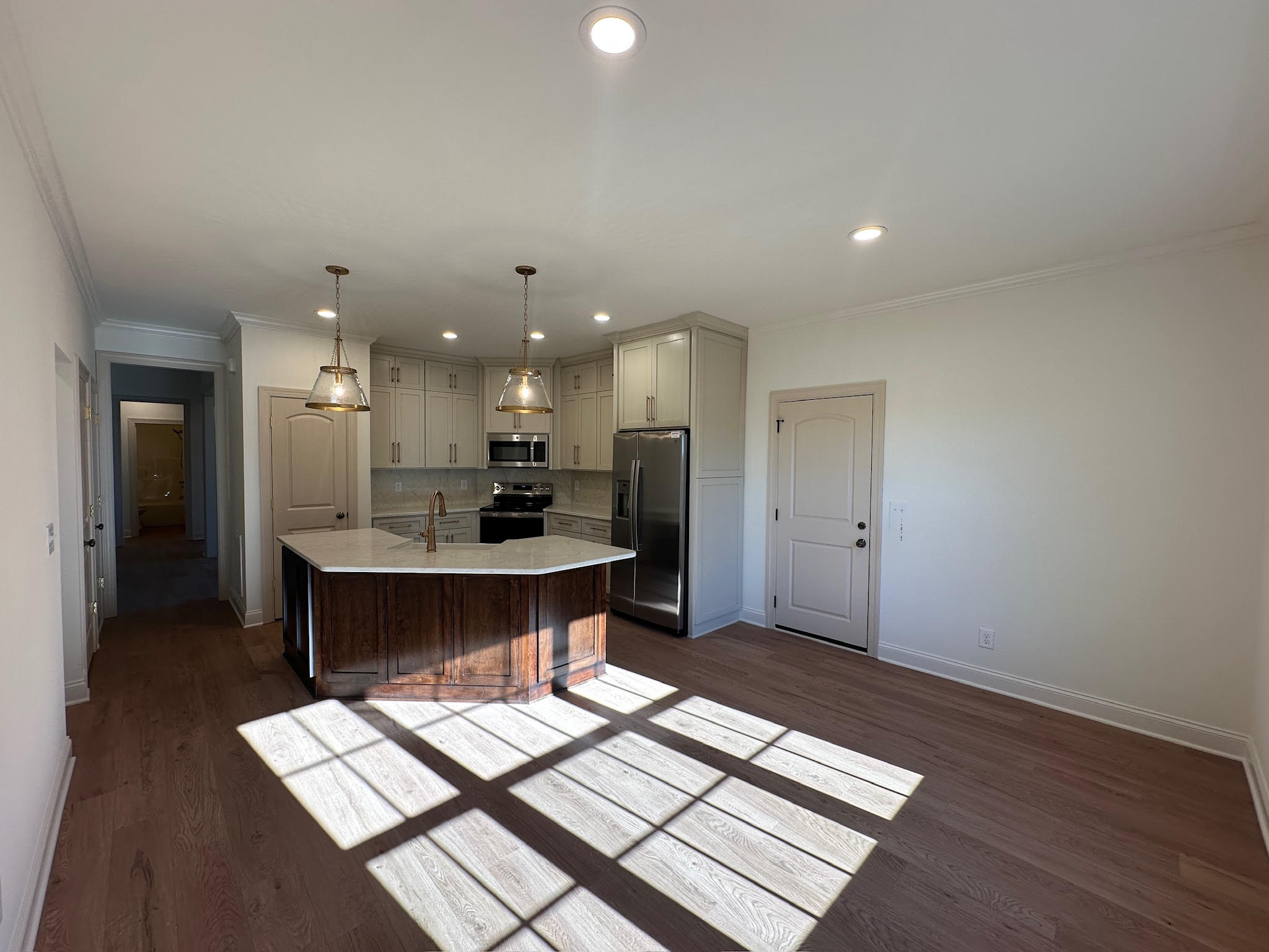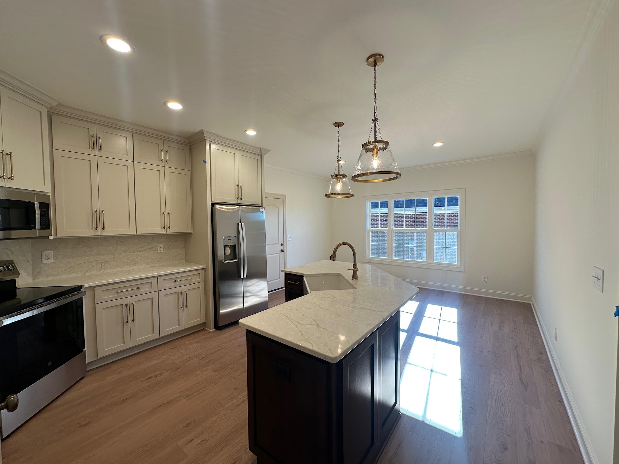The kitchen is designed to be both functional and visually striking, featuring custom cabinetry, quartz countertops, stainless steel appliances, and a spacious island with seating. Statement pendant lighting and a thoughtful layout make the kitchen a true centerpiece, seamlessly connected to the dining and living areas.